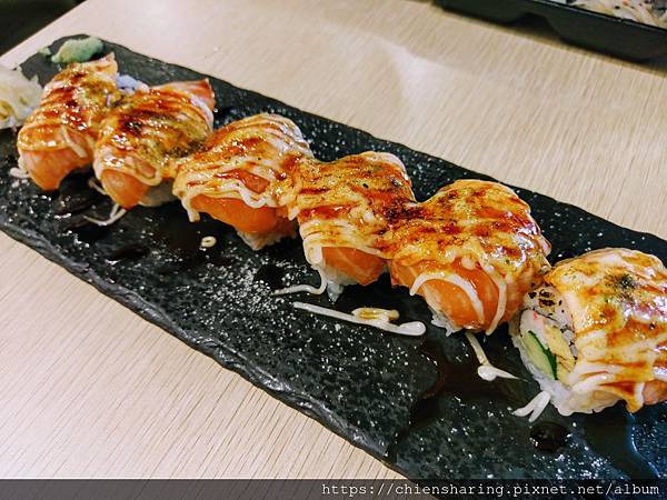 鮭魚很新鮮,焦糖因為經過炙烤,所以會有甜脆的口感,另外有別於一般的握壽司,師傅在壽司卷裡包入了新鮮小黃瓜,又多了清爽脆口的層次呢!