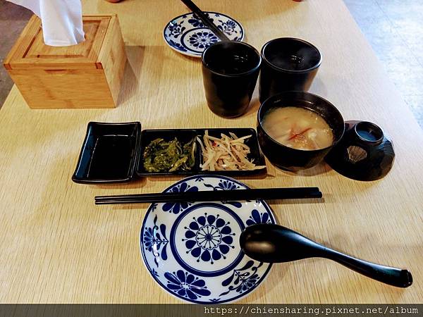 一開始會先送上2杯熱麥茶,丼飯有附小菜跟味噌湯,海帶跟牛蒡絲我還滿喜歡吃的,味噌湯味道有點清淡~![]()
