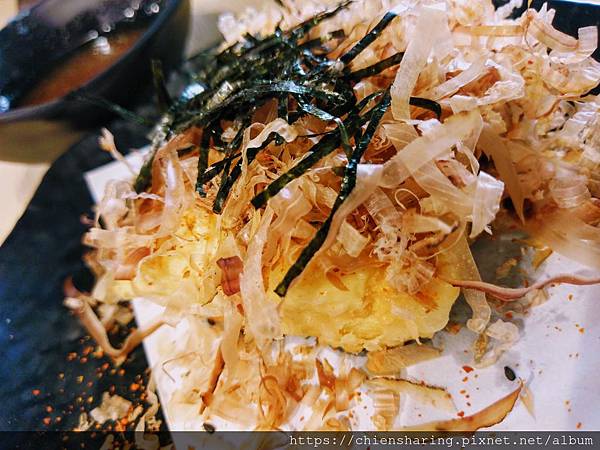 揚出豆腐總共有4塊,是用雞蛋豆腐做的炸物,上面鋪滿柴魚跟海苔絲,一起搭配專用的蘿蔔泥沾醬,清爽不膩口!